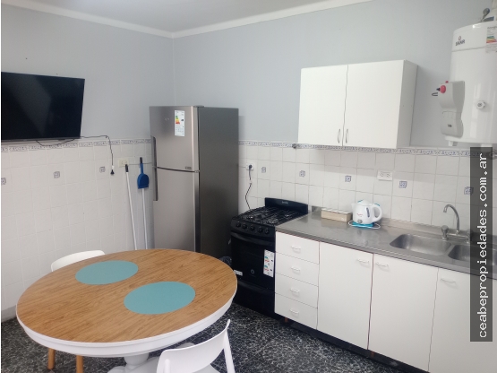 Cocina comedor con mesa, sillas y heladera a estrenar.